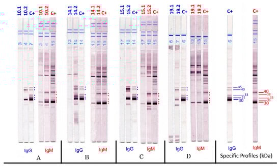 - Jost, C.; Touafek, F.; Fekkar, A.; Courtin, R.; Ribeiro, M.; Mazier, D.; Paris, L. Utility of immunoblotting for early diagnosis of toxoplasmosis seroconversion in pregnant women. Clin. Vaccin. Immunol. 2011, 18, 1908–1912. [Google Scholar] [CrossRef] [PubMed] [Green Version]