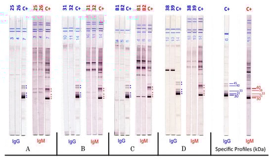 - Khammari, I.; Saghrouni, F.; Lakhal, S.; Bouratbine, A.; Ben Said, M.; Jalel, B.A. New IgG Immunoblot Kit for Diagnosis of Toxoplasmosis in Pregnant Women. Korean J. Parasitol. 2014, 52, 493–499. [Google Scholar] [CrossRef] [PubMed]