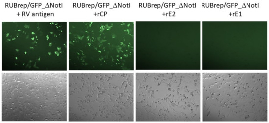 GFP expression in RUBrep/GFP_ΔNotI-transfected Vero cells with supplemented recombinant RuV proteins. Vero cells in a 48-well plate were transfected with the replicon RNA mixed with 100 ng of inactivated RuV antigen or recombinant RuV SP (Abcam, Cambridge, MA, USA) as indicated. The images were taken at 48 h post-transfection at 100× by Axiovert 200 (Carl Zeiss). The phase contrast images for each of the four transfections taken from the same field are shown at the bottom.
