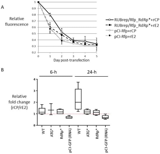 The results from above showed that, similar to the de novo synthesized intracellular CP [], rCP mainly enhanced replication of the gRNA, particularly (−) RNA synthesis (Figure 4 and Figure 5), suggesting that CP have a specific function in copying the genomic RNA (possibly being a part of the replication complex) and/or improving the intracellular machinery that favors viral replication, e.g., an environment which leads to less viral RNA degradation. By screening a spectrum of replicons with mutations in the termini [,] and NSP, we noticed that rCP rescued some but not all of the mutants, and some mutants were rescued when both wild-type NSP and rCP were present (Table 2). The mutants that were rescued by rCP alone had defects in p150 or p90; in addition to the replicons with deletions in the Q domain (ΔNotI or NSP-RFP), replicons with a mutation in the NSP cleavage site (1301S), in the RdRp domain (GA1967D), or with extended C-terminus (p90-His) were all rescued by rCP. Since the mutations rescued were in many locations, the possible mechanism of rCP-enhanced replication by trans-complementing a specific domain in the replication proteins is unlikely. To test if rCP enhanced replication by increasing RNA stability, we first monitored the intracellular fluorescence of fluorescently labeled RUBrep/Rfp_RdRp* and pCI-Rfp RNA over a 5 d timeframe. The total fluorescence from each time point was normalized to the fluorescence at day 0. We found that, at 24 h post-transfection, there were approximate 1.33-fold more signals from RuV RNA species if the RNA was mixed with rCP than that with rE2, while this ratio was ~1.02 with control RNA (Figure 6A). To confirm this observation, we compared the effect of rCP on RuV RNA retention from different constructs, including RUBrep/GFP (WT), RUBrep/GFP_NSP-ATG* (ATG*; a replicon with NSP start codon mutated to TAG), RUBrep/GFP_RdRp*, and RNA from pCI-GFP, in cells within 24 h post-transfection. The changes in the amount of target RNA over a period of time was calculated using the fold change expression method (ΔΔCt), where the ΔCt (=CtGFP − CtGAPDH) at the specific time point was subtracted from the ΔCt at 0 h time point. The relative ΔΔCt (rΔΔCt = ΔΔCtrCP_N-h/ΔΔCtrE2_N-h), which was calculated by the ratio of the ΔΔCt from the transfection with rCP and the ΔΔCt from the transfection with rE2, was used to reflect the effect(s) (or dependence) of rCP on the input RNA template, in comparison with the presence of rE2, over a period of time.