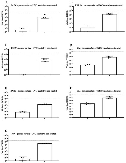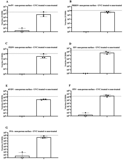 Inactivation of viruses in the contaminated porous surfaces by UVC treatment. Titration of independent triplicates in UVC treated and non-treated surfaces for Swine Poxvirus (A), Porcine Reproductive and Respiratory Syndrome Virus (B), Porcine Epidemic Diarrhea Virus (C), Swine Influenza Virus (D), Bovine Viral Diarrhea Virus (E), Porcine Parvovirus (F), and Senecavirus A (G). Individual result for the triplicate testing is represented by circles (treated group) or squares (control group). Boxes represent triplicate averages, and bars represent the standard error of the mean. The dotted line represents the titer of the virus inoculum.