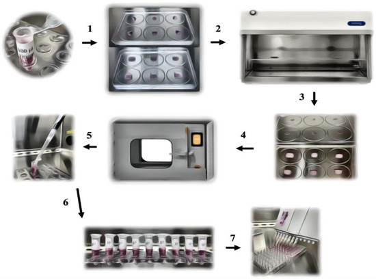 A total of 100 µL of the virus is placed on the testing surface (1) and maintained in the biosafety cabinet (2), and allowed to dry for 30 min (3). Samples were then moved to the UVC chamber for the 5 min treatment (dose of 360 mJ/cm2) (4). Following treatment, samples were resuspended in 1 mL of MEM (5), and eluted samples were serially diluted (6) for the virus titration assay (7).