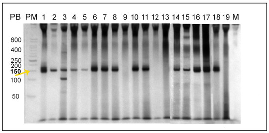 Polyacrylamide gel electrophoresis of the multiplex PCR products aiming to detect Leishmania sp. DNA. (PM) 50 bp ladder; (1–8) represent positive samples from the 2 animals in group Lb1: 1 and 6 sites of inoculation, 2 and 5 abdominal skin, 3 and 8 liver, 4 and 7 spleen; (9–13) represent samples from group Lb2, being animal 1, the hamster in which L. braziliensis were reisolated: 9 abdominal skin, 10 spleen, 11 liver of animal 1; 12 abdominal skin, 13 spleen of animal 2; (14–17) represent positive samples from the 2 animals in group Li2: 14 and 16 spleen, 15 and 17 liver; (18) Positive control; (19) Negative control; (M) Mix PCR. The arrow and the positive sign indicate the expected size of base pairs (between 120–145 bp).