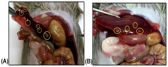 The animals intragastrically infected with L. braziliensis were followed up weekly for 6 months, and no apparent clinical changes were observed. However, at necropsy, in one of them, it was possible to observe nodular, pale, crusted lesions suggestive of Leishmania sp. infection in the liver and spleen (Figure 2).