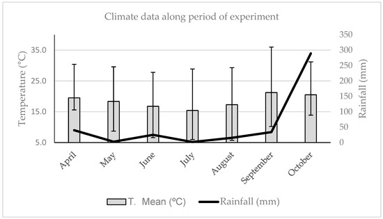The highest averages of temperature recorded were in 30.4 °C (April), 36 °C (September), and 31.2 °C (October), at the beginning and end of the experimental period, respectively. The average temperatures recorded were 19 °C, 21 °C, and 20 °C in April, September, and October, respectively. In these months, the highest levels of rainfall were also recorded, with 39.8 mm in April, 33.8 mm in September, and 289.4 mm in October. It was observed that the months with higher temperatures also had the highest average rainfall. During the months of May to August, the lowest average indices of temperature and rainfall were recorded, characterizing the dry period. The minimum temperatures during these months were 8.7 °C in May, 6.6 °C in June, 6 °C in July, and 5.7 °C in August. The average temperatures were 18 °C in May, 17 °C in June, 15 °C in July, and 17 °C in August. The rainfall during this period was 2.6 mm in May, 25.00 mm in June, 1.8 mm in July, and 15.4 mm in August.