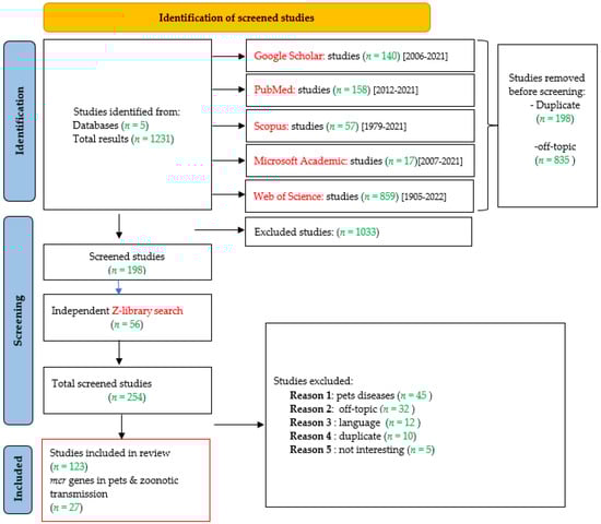 This systematic review was conducted according to meta-analysis guidelines (PRISMA) []. Harzing’s Publish software, Version 3, Anne-Wil Harzing (Middlesex University, London, UK) was used to improve the search fields and to scan all published studies []. The databases used to perform a global bibliography search were as follows: Google Scholar, Web of Science, PubMed, Scopus, and Microsoft Academic. The keywords used in the systematic search were “colistin resistance”, “polymyxin resistance”, “mcr genes”, “pets”, “companion animal”, “dog”, “cat”, and “zoonotic transmission”. An additional online research for discussion results was performed using Z-library [].