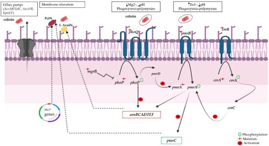 Bacteria are exposed to several antimicrobials or environmental stimuli such as colistin, which is a cationic antimicrobial peptide (CAMP) that leads bacteria to develop strategies to protect themselves [,]. One of the described mechanisms of resistance to colistin is mutations, which are the first protection means against the alteration of the bacterial membrane [,,]. Figure 2 schematically illustrates the mechanism of colistin resistance induced by chromosomal mutations. Activation of the two-component system (TCS) PmrA/PmrB generates the upregulation of the operons pmrCAB and arnBCADTEF-pmrE (pmrHFIJKLM). The last cascade of activation stimulates the synthesis and transfer of phosphoethanolamine (PetN) and l-Ara4N to the 4′-phosphate group to lipid A in the membrane lipopolysaccharide (LPS). It should be noted that LPS is the primary target of colistin. The addition of cationic groups to the surface of LPS increases its positive charge and decreases the affinity to polymyxin [,]. The PhoP/PhoQ TCS can directly activate the PmrA/PmrB TCS via the PmrD regulator [,]. However, direct activation of the operon arnBCADTEF can be managed by PhoP independently of pmrD []. In addition, the mgrB and micA genes have negative feedback on TCSs (PhoP/PhoQ). This feedback is monitored by inhibition of the kinase activity on PhoQ and/or by stimulating its phosphatase activity. Any mutations in this system, therefore, lead to the overexpression of PhoP/PhoQ that activates the pmrD activator (pmrA activation) and pagL lipid A deacylation [,]. Moreover, other colistin resistance mechanisms have been reported such as (i) the phosphorylation of pmrE or Ugd by Etk (tyrosine kinase) leading to alteration of the LPS structure, (ii) the alterations in Kdo (3-deoxy-d-manno-octulosonic acid), residues of LPS which can induce colistin resistance in E. coli, or (iii) mutations in mgrR which increase colistin resistance in E. coli [,].