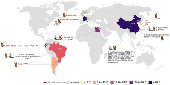 The zoonotic transmission of mcr-carrying enterobacteria was previously suggested in four studies from China and Ecuador. Zhang et al. (2016) suggested a potential transmission of mcr-1-positive E. coli between dogs and humans. This suggestion was based on the isolation of clonally related mcr-1-producing strains (by multilocus sequence typing and pulsed-field gel electrophoresis profiles (PFGE)) from dogs and a pet shop worker in China []. Following this study, Lei and his colleagues reinforced this suggestion when they investigated the prevalence of mcr-producers in companion animals in Beijing. They observed clonal relatedness (the same PFGE patterns) between mcr-1-positive E. coli isolated from dogs, cats, and one pet owner. In the same study, pet food samples were positive for the mcr-1 gene, suggesting that several factors may contribute to the emergence of mcr-1 in pets []. In addition, another Chinese study reported significant mcr-1 carriage between dogs and their owners, where the carriage of this gene by owners was a risk factor for its presence in dogs []. Lastly, the owner of a dog who was tested positive for intestinal carriage of mcr-1-producing E. coli was reported as the first case of mcr-1 carriage in Ecuador []. Furthermore, pets harbor bacteria that require the use of polymyxin for treatment, including methicillin-resistant Staphylococcus aureus, methicillin-resistant Staphylococcus spp., vancomycin-resistant Enterococcus, and ESBL- or carbapenemase-producing Enterobacteriaceae and Gram-negative bacteria []. The mcr-1 and mcr-2 colistin resistance genes, in particular, have a high potential for zoonotic transmission (being predominant in animals rather than in humans) []. According to one study on 229 Chinese families, there was a significant co-occurrence of mcr and β-lactamase genes in dogs and their owners. The mcr-1 and blaCTX-M genes were found to be present in 2.7% and 5.3% of the population, respectively []. In Egypt, researchers reported a high potential of animal–human transmission of blaVIM-4-, blaOXA-244-, and mcr-9-producing E. hormaechei. The transmission was associated with respiratory infections. These bacteria also harbored β-lactam and carbapenem resistance genes; this was the first report to confirm their potential animal-to-human transmission []. According to another study conducted in Argentina, dogs can carry mcr genes and blaCTX-M-2 co-producing E. coli (ST770) previously reported in humans []. Due to the close relationship between pets and their owners, the microbiota of pets and humans share a diversity of bacteria and ARGs []. Dogs and cats host zoonotic microorganisms due to their close physical contact with humans (licking, petting, and contact with furnishings) including around pets’ spaces (carpets and beds) []. The exchange of pathogenic microorganisms and resistance genes between animals and their owners has frequently been reported [,]. In some cases, ARGs found in hospital patients were similar to those found in pets. As a result, vigilance is required against the zoonotic transmission of resistant bacteria, which are shared between pets and their owners [].