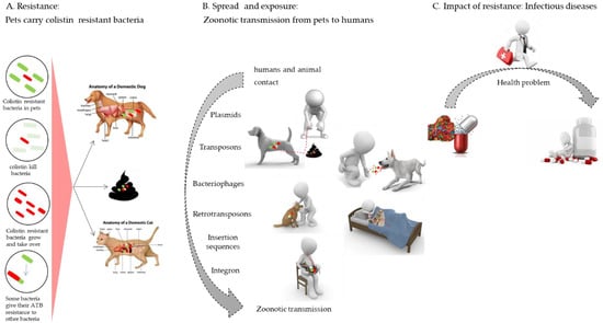 Across history, humans have cared for certain animals and continue to share their daily lives with pets, especially cats and dogs. Approximately 223 million pets are owned worldwide today []. These animals provide psychological support, and they are faithful and enjoyable companions []. However, owners are frequently exposed to pathogenic and zoonotic bacteria harbored by their pets [,]. Considerable care is often given to companion animals in order to prevent them from catching infections. For this purpose, several antibiotics including polymyxin are regularly administered as prophylaxis to pets, including those that are also authorized for human use []. Antibiotics are widely considered to be the most effective treatment for bacterial infections in pets; hence, their loss of efficacy can result in serious therapeutic difficulties for animals and humans []. Colistin (polymyxin E) is a cationic antimicrobial peptide that was first discovered in 1947 and was first used in human medicine in 1959 but abandoned in the 1980s because of its nephrotoxic and neurotoxic effects []. However, colistin, which is a powerful molecule, was reintroduced because of the emergence of multidrug-resistant Gram-negative bacteria (GNB), especially those resistant to carbapenems []. Polymyxin has been commonly used in veterinary medicine for both pets and food animals for several years. On the other hand, polymyxin E is a last-resort antibiotic against certain multidrug-resistant bacterial infections []. Alongside colistin use, colistin-resistant bacteria emerge through two mechanisms: (i) via chromosomal gene mutations such as mutations of the two-component system (TCS) phoP/phoQ and mgrB regulator leading to the modification or the complete loss of the membrane lipopolysaccharide layer, and in addition, several mutations that activate the pmrA/pmrB (TCS) are characterized as polymyxin resistance mediators [,]; (ii) via a mobile colistin resistance gene (mcr) on a conjugative plasmid discovered in 2015 by Liu et al. in Escherichia coli isolated from pigs in China, thus generating a global health interest []. Currently, a total of ten mcr variants (mcr-1 to mcr-10) have been reported in the literature [,,,,,,,,]. A few years after the discovery of mcr genes, this mechanism has been disseminated worldwide and reported in humans, animals, food, and the environment, with some of them in zoonotic cases [,,,]. Colistin resistance genes have been evidenced in animals more than in humans []. Thus, animals may play a crucial role in the transmission of mobile colistin resistance genes (mcr) [,]. The close contact between humans and pets increases favorable conditions for the transmission of antibiotic-resistant bacteria through their tight behavior []. Previously, several antibiotic resistance genes (ARGs) that were discovered in dogs, cats, and birds were shared with their owners [,,]. Colistin resistance genes (mcr) are usually located on mobile genetic elements (i.e., transposons) mainly vehiculated by conjugative plasmids which facilitate the dissemination of mcr genes among bacteria [,]. Humans and animals can exchange diverse bacterial antibiotic resistance genes (ARGs) via physical contact. The zoonotic transmission of bacteria harboring ARGs is more frequent when it covers food animals or animals in direct contact with humans such as pets []. Exchanging plasmids carrying ARGs accentuates the risk of zoonotic transmissions leading to infectious diseases difficult to treat [,,,,,]. In the present review, we report colistin-resistant bacteria in pets (i.e., dogs and cats) and discuss the risk of zoonotic transmission of such bacteria from these animals to their owners.