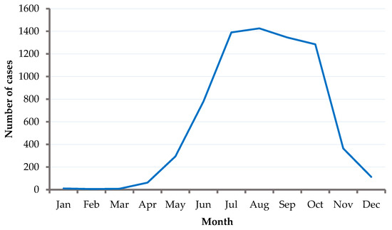 The number of cases reported shows seasonal variation. The number rises in March, peaks in August, and declines in October (Figure 2).
