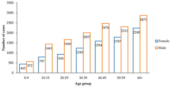 TBE Key risk groups: number of TBE cases by age group and gender reported in 16 EU/EFTA countries (2000–2010, n = 22,378). Source: data from the ECDC (https://register.ecdc.europa.eu/) (accessed on 19 January 2021).