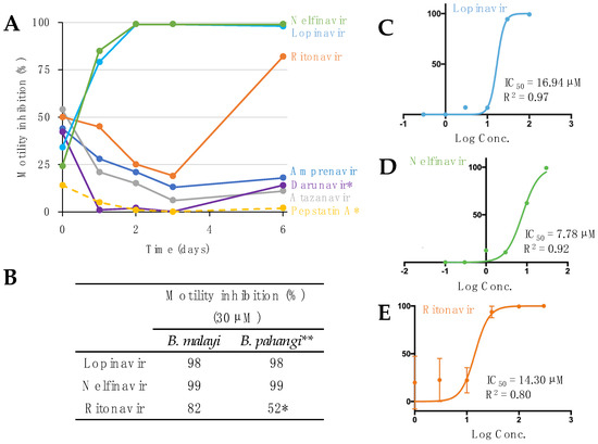 Aspartic protease inhibitor effects on motility in B. malayi. (A) Motility inhibition (% relative to DMSO) of adult female B. malayi treated in vitro with aspartic protease inhibitors over the course of 6 days. * All compounds treated at a concentration of 30 µM, except darunavir and pepstatin A, which were at concentrations of 50 µM. (B) After 6 days of treatment, the three APIs effective on B. malayi were also effective on B. pahangi. * Ritonavir was at 10 µM in B. pahangi; ** Results from Tyagi et al., 2021 [13]. IC50 values of (C) lopinavir, (D) nelfinavir, and (E) ritonavir with adult female B. malayi, based on in vitro treatment for 6 days at six different concentrations, and four replicates per concentration.