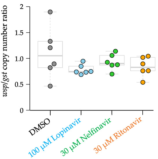 Determining Wolbachia titers in adult female worms provided insight on whether these endosymbiotic bacteria were affected by the APIs. Previous studies showed that because filarial worms including the Brugia species are dependent upon Wolbachia for survival and fecundity, eliminating the endosymbiotic bacterium would result in worm death [5,11,12,67]. However, the qPCR results showed that the APIs lopinavir, nelfinavir, and ritonavir had no effect on the Wolbachia titers when compared with the control, suggesting that the APIs are likely not affecting the Wolbachia, but instead have a direct effect on the worms.
