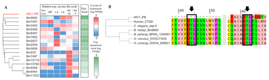 Sequence conservation and gene expression analysis of the B. malayi aspartic protease Bm8660. (A) Protein sequence-based clustering of the HIV-1 protease and all of the B. malayi aspartic proteases identified by MEROPS (sequence alignment using T-Coffee, clustering with Clustal Omega). The relative gene expression (Z score of log FPKM) and average absolute expression level (log FPKM, in green) of aspartic proteases across the life cycle are shown, based on RNA-seq data collected from Choi et al., 2011 [44]. Bm8660 was the closest B. malayi ortholog to HIV1 protease and had high expression in L4 and adult stages. (B) Sequence-based alignment and clustering of top-hit orthologs of Bm8660 among filarial worms, C. elegans (the lysosomal aspartic protease ASP-4), and human (Cathepsin D, CTSD). Arrows indicate two conserved aspartic protease catalytic triads (DTG).
