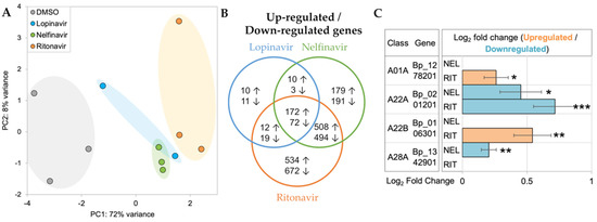 Principal components analysis (PCA) of RNA-seq datasets showed separate clustering of the API-treated worms from the untreated group, suggesting the early transcriptomic responses from the API-treated worms were distinct from those of the controls (Figure 5A). Differential expression analysis identified significantly upregulated/downregulated genes in lopinavir (upregulated: 204, downregulated: 105), nelfinavir (upregulated: 869, downregulated: 760), and ritonavir (upregulated:1226, downregulated: 1257) compared to DMSO controls, respectively. Among them, more than 40% of differentially expressed genes were shared with at least two comparison groups (upregulated: 49.2%, downregulated: 40.2%), particularly between nelfinavir and ritonavir. This indicated that API treatments could elicit common and unique transcriptional responses in adult female B. pahangi (Figure 5B). Four of the 14 APs identified by MEROPS were differentially regulated by the APIs (Figure 5C). Of these, two genes encoding cathepsin E (BPAG_1278201) and signal peptide peptidase-like protein (BPAG_106301) were significantly upregulated by ritonavir. A presenilin 1 gene (BPAG_1346801)—a critical regulator of ErbB/EGFR [53] signaling pathway—was downregulated by both ritonavir and nelfinavir. Interestingly, a DNA damage-inducible 1 homolog (BPAG_1342901) whose activity can be directly inhibited with nelfinavir-treated cancer cells [54,55], was significantly downregulated only in nelfinavir. Gene annotations, read counts, normalized expression values, and differential expression statistics for all genes in all samples are provided in Supplementary Table S3.