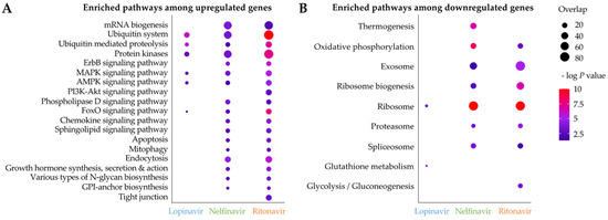Next, we identified significantly enriched KEGG pathways among upregulated/downregulated genes in the API treatments (Figure 6). Most enriched pathways were observed in nelfinavir and ritonavir, due to the lack of differentially expressed genes in lopinavir. We found that KEGG pathways involved in ubiquitin mediated proteolysis, protein kinases and MAPK/AMPK/FoxO signaling pathways were significantly enriched among upregulated genes in all API treatments (Figure 6A). Upregulation of genes related to the ubiquitin mediated proteolysis may be related to potential inhibition of the filarial lysosomal AP (Figure 3C,E,H) by APIs, consequently affecting protein degradation and increasing the burden of protein aggregates. The ubiquitin proteasome system and autophagy-lysosomal pathway constitute a single network to regulate proteostasis [56]. In addition, lopinavir, nelfinavir and/or ritonavir have been shown to trigger an accumulation of unfolded proteins, subsequently inducing an unfolded protein response (UPR) and ER stress, which can result in cell cycle arrest and/or apoptosis in mammalian cells [57,58,59,60,61,62,63]. Signaling pathways such as MAPK are evolutionarily conserved mechanisms for regulating cellular proliferation, differentiation, and survival, and can be activated via various extracellular stimuli [64]. We observed that genes involved in proteolysis and the several signaling pathways were immediately modulated in B. pahangi after the API treatments, which were corroborated by similar findings in previous mammalian cells [57,58,59,60,61,62,63].