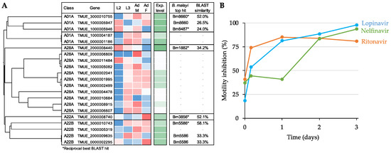 The primary goal of the RNA-seq analysis was to capture the early transcriptional responses of adult female B. pahangi after the in vitro API treatments, in the hope that we could identify differential gene responses to the aspartic proteases and identify molecular pathways affected by treatment. The differential expression analysis showed that four of the 14 AP genes in B. pahangi were differentially expressed in nelfinavir and/or ritonavir, but not in lopinavir (Figure 5C). Lopinavir showed the least transcriptional responses, compared with nelfinavir and ritonavir, possibly because strong transcriptional changes may occur more gradually with this drug (Figure 5B). One of three biological replicates closely clustered with the untreated group (thus, considered as an outlier and removed from downstream analysis) and the other two replicates had a lower correlation coefficient compared with the replicates of the other two APIs, resulting in the under-detection of DEGs in lopinavir-treated worms. It is possible that in vitro treatment of lopinavir at 100 µM for 1 h may not be sufficient to trigger significant transcriptional changes in adult female B. pahangi; the motility of the worms after the treatments was not critically affected (data not shown).