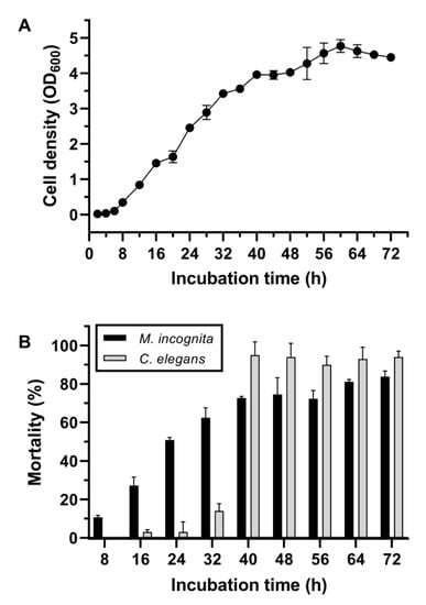 The isolate No. 5-7 was subjected to the assays of cell growth and the corrected mortality against M. incognita and C. elegans at different growth phases. Figure 1A shows a fast growth profile of this isolate under normal culturing conditions by entering the logarithmic growth phase at approximately 6 h, the stationary phase at approximately 40 h, and the decline phase at approximately 60 h. Monitoring of the corrected mortality of isolate No. 5-7 against M. incognita showed a fast and steadily increasing pattern during the culture time-course, suggesting the constitutive production of toxic substances by M. incognita along with synchronous cell growth. In contrast, the substantially corrected mortality against C. elegans appeared in the stationary growth phase and then maintained high levels across the rest of the culture time course (Figure 1B). Therefore, these results suggest in principle that the toxic substances against M. incognita and C. elegans were different and were synthesized at different growth phases by this strain.