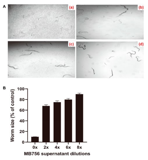 Inhibitory effect of MB756 culture supernatant on the growth of C. elegans L1 larvae. (A), Morphology of C. elegans larvae after treatment with 0 (a), 2× (b), and 8× (c) diluted MB756 culture supernatants for 3 days. Larvae in LB broth (d) were used as the negative control; (B), Growth assay of C. elegans treated with gradient doses of MB756 culture supernatant for 3 days. Error bars represent the standard deviations from the means of three independent experiments.