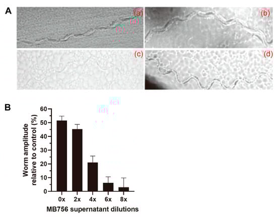 Effect of MB756 culture supernatant on C. elegans motility. (A), Track patterns of larvae on NGM plates with C. elegans L4 larvae treated with 0× (a), 2× (b), and 8× (c) diluted MB756 culture supernatant for 24 h. Larvae treated with only NGM medium were used as the negative control (d). (B), The calculated amplitude values of the worm tract under different dilutions of MB756 culture supernatant. Six larva individuals were assayed in each experiment. Error bars represent the standard deviations from the mean of three independent experiments.