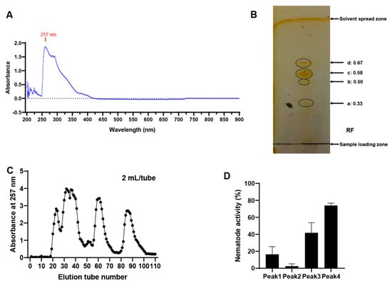 Full-wavelength adsorption scanning (A), TLC (B), SGCC (C), and bioassays against M. incognita (D) of the ethyl acetate extract of the MB756 SCS. TLC plate was fumigated with iodine vapor for color development.