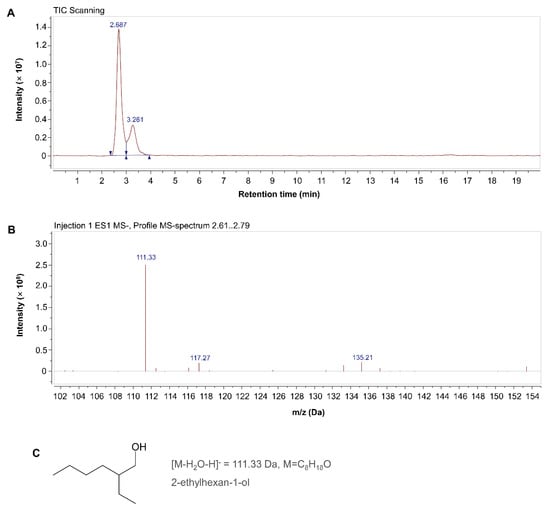The main M. incognita-toxic substance in the 4th eluted peak of the MB756 SCS was assayed using LC–MS. Figure 8A shows that there were two scanning peaks at retention times of 2.687 and 3.261 min in the liquid-phase TIC scanning profile. Subsequent ESI MS scanning in the spectrum region of 2.61–2.79 min was performed, yielding a mass peak spectrum at m/z 111.33 [M-H2O-H]−, which corresponds to a substance with a molecular formula of C8H18O and a relative Mw of 130.33 Da based on a search of a highly matched substance with the highest degree in the chemical database. 1H NMR (400 MHz, chloroform-d, ppm) chemical shifts of the compound were as follows: δ 3.51 (dd, J = 5.3, 1.6 Hz, 2H), 1.75 (s, 1H), 1.46–1.15 (m, 8H), 0.87 (td, J = 7.1, 3.0 Hz, 6H). This substance exhibits fundamental characteristics similar to those of a previously reported nematicidal substance by Zhang et al. [], namely, 2-ethylhexan-1-ol. We are, therefore, preliminarily identifying this substance as 2-ethylhexan-1-ol, with the structural formula shown in Figure 8C.