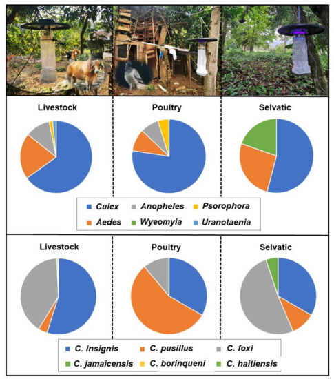 Schematic representation of the distribution of mosquitoes (above, by genera) and Culicoides (below, by species) across the three habitats sampled in Jarabacoa (Dominican Republic) by CDC UV light traps.