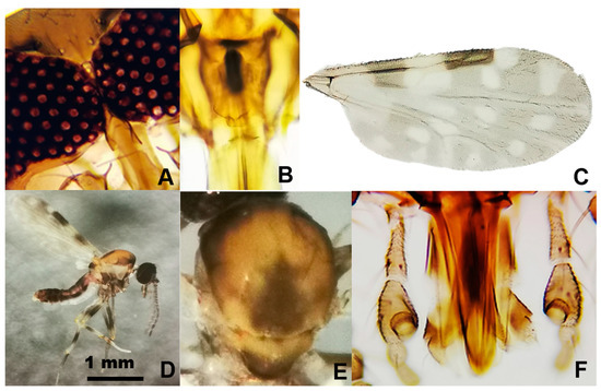 Culicoides haitiensis: (A) eyes, (B) cibarium, (C) wing, (D) general aspect, (E) scutum and scutellum, and (F) palps.