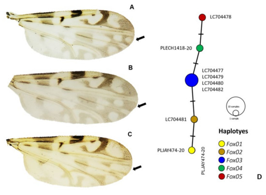 Culicoides foxi morphospecies and haplotypes. (A) The typical morphospecies with a pale spot on m1; (B) the morphospecies without a spot on m1; and (C) the morphospecies with both spots on m1 joined. The arrows indicate the position of the spots. (D) Median joining network of the haplotypes. Note: each circle represents a haplotype.