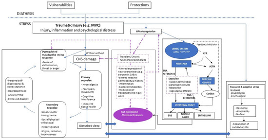The diathesis-stress model [8] recognized that people bring their unique diatheses (vulnerabilities and protections) to the experience of trauma, positioning these as pre-existing drivers of the peri- and post-trauma experience. In a bio-psycho-socio-spiritual context, Walton and Elliott [8] posited that those individual diatheses play an important role in directing, but not predetermining, a person’s recovery trajectory. We believe that the gut microbiome is an important contributor of the stress-diathesis response, in that dysbiosis is likely to be present prior to the experience of new trauma, and is sufficient to precipitate an adverse chain of events following injury, potentially exacerbated in people with biological and psychological vulnerabilities. Below, we present a narrative overview of recent advances in this field, including potential mechanistic pathways to explain such a link. Drawing on current interdisciplinary research, an integrated conceptual model of the relationship between individual diatheses and the gut microbiome is proposed, with a view to exploring non-recovery in post-injury events (see Figure 1). This updated model explores the complex communication system in the microbiome-gut-brain axis [36,37,38]—mediated via the hypothalamic–pituitary adrenal axis, immune response and cortical functioning [37,38,39,40,41,42,43,44]—and how it may underlie pain and (non-)recovery following the experience of trauma. All three pathways are explored below.