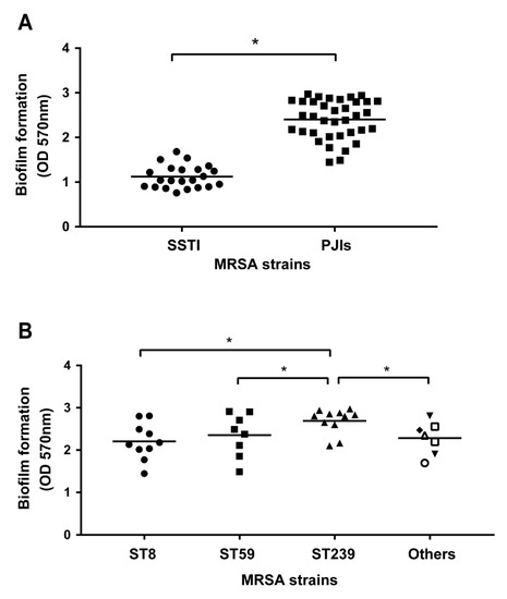 Biofilm formation of MRSA clinical isolates. The biofilm formation of MRSA isolates was investigated after 24 h incubation in a microtiter plate: (A) Comparison of biofilm formation capacities of MRSA from the skin and soft tissue infection (SSTI) (n = 22) and periprosthetic joint infection (PJIs) (n = 36). Each shape (● and ■) represents individual isolates, and bars indicate the means, * p < 0.05 are considered significant; (B) biofilm formation of PJIs-MRSA clinical isolates with different ST types. Each shape (●, ■, ▲, ▼, ◆, ○, □, and △) represents individual isolates categorized into different ST types, and bars indicate the means, * p < 0.05 is considered to be significant. In other ST strains, the shapes ▼, ◆, ○, □, and △ represents ST5, ST7, ST45, ST508, ST1232, respectively.