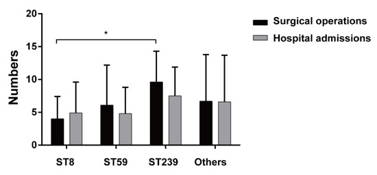 To further explore the potential relationship between MRSA genotypes and clinical features, the disease phenotypes or severity in PJI patients were analyzed using data from patient records. A medical record review and analysis showed that the number of surgical debridements and the number of hospital admissions were generally high for PJI patients with ST239-type MRSA infection as compared with the other ST types of MRSA (Figure 2). These results implicated that ST239-type MRSA infection could cause more refractory cases than infection with the other ST types of MRSA in PJI patients.