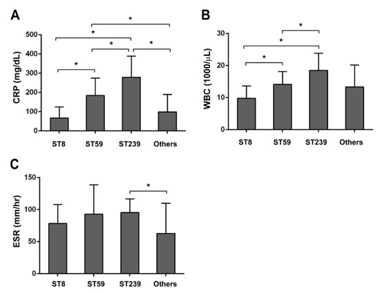 All types of MRSA isolates from PJIs were further linked to medical records. CRP, WBC, and ESR are inflammation-related biomarkers, including bacteria-caused infection. The CRP and ESR are the two most commonly published serum biomarkers and first-line screening tests in PJIs [25]. Regarding the means of inflammation-related biomarkers of pre-operative PJI patients, the intensity of expression levels of CRP and WBC were ST239, ST59, and then other ST and ST8 types (Table 6 and Figure 3). The ESR in the ST239 type was significantly higher than other ST-type MRSA. Interestingly, a noticeable symptom of pre-operative fever was observed in ST239.