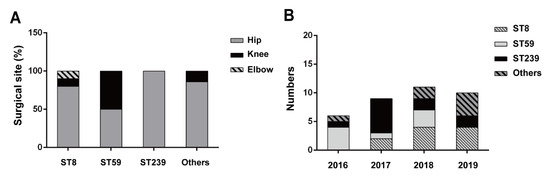 We regrouped the patient’s demographics by different ST types of MRSA. After analysis, we found eighty percent of the ST8-type MRSA in the men’s cases (n = 8), whereas the average age of MRSA infection seemed to be younger in the ST239 type (Table 7). Particularly, we noticed that most of the ST239 infections in PJIs (nine out of eleven cases) occurred in chronic hepatitis and cirrhosis (CHC) patients (Table 6). For analysis of infection sites, although there were only six cases of knee PJI included in the study (Table 1), we found that these knee PJIs were mainly caused by ST59-type MRSA (four out of six cases) (Figure 4A). It is also worth noting that all ST239-type MRSA (n = 11) were found only in hip PJIs, but not in knee or elbow PJIs (Figure 4A). Additionally, according to the collection years, the temporal distribution of MRSA genotypes in PJIs was determined in the study. As shown in Figure 4B, increasing trends for the ST8 and other ST types were observed in PJI patients from 2016 to 2019.