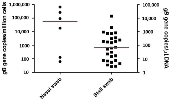 Absolute quantitation of EHV-1 expressed as number of target gB genes per million cells in nasal swabs from healthy shedders and as number of target gB genes per µL of purified genomic DNA for stall swabs. The horizontal red lines represent median values.