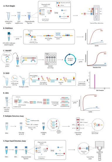 Simplified workflow of the exemplar POCTs. (A) In the OLA-Simple workflow, using pre-made dry reagents, RNA is used to make PCR products that will undergo oligonucleotide ligation. In this step, mutant (Mut)/wild-type (WT) probes with a reporter molecule will bind adjacent to a common probe with biotin to a complementary sequence on the template. The ligation products are eventually visualized using a lateral flow device; (B) PANDAA workflow, displaying how primers and probes bind to their specific target to determine the mutation of interest. Starting with the binding of PANDAA primers, qPCR will generate a homogenous population with a probe-binding region, followed by the annealing of a target-specific probe with FAM fluorophore (F) to detect the single nucleotide polymorphism. Wild-type specific probes are labelled with VIC fluorophore (V) for comparison. (C) The SMART assay combines molecular biology with microfluidics. The ssDNA probes are first added to RNA, where the SMART probe will bind to the mutation sequence and the BCO binds to a conserved sequence. Next, a SMART microchip will facilitate the separation of bound and unbound probes from well 1 to 2. This step is followed by a modified NASBA that will amplify probes and generate a sequence for a molecular beacon to identify the presence or absence of a mutation. (NC = negative control). (D) The MAS assay utilizes ASPE primers labelled with Tag to discriminate against a mutation. Primers are first added to a PCR product, and multiplex ASPE ensues. While amplification proceeds, biotin is incorporated into the final product and the Tag/anti-Tag sequences will bind to one another. After, a reporter dye will find biotin and detect hybridized products using a suspension array system. Data is then recorded by measuring the mean fluorescence intensity (MFI). (E) The LRA assay starts with adding RNA template to a reaction mixture containing ligases, DNA polymerases and oligonucleotide primers. Ligation occurs between a common probe that is complementary to the RNA template and a detector probe that is complementary to the variant. DNA polymerase will then become activated, and qPCR will amplify ligated products using dual-labelled probes with fluorophore (F) and quencher (Q) for detection. (F) Multiplex detection assay that uses specific primers with a Tag sequence and a lateral flow dipstick to detect mutations. PCR samples undergo a multiplex SSPE, and biotin is incorporated into the extended products. As amplicons flow through the dipstick, they bind to a complementary anti-Tag and anti-biotin antibodies with gold nanoparticles will produce red dots for identification. (G) A paper-based assay that combines different techniques to detect HIVDRM. It starts with RPA, followed by oligonucleotide ligation at the site of interest. Products are then applied to an ELISA lateral flow assay, where fixed antibodies will hybridize with reporter molecules. Then streptavidin conjugated with horseradish peroxidase binds to biotin to produce brown precipitates for signal detection.