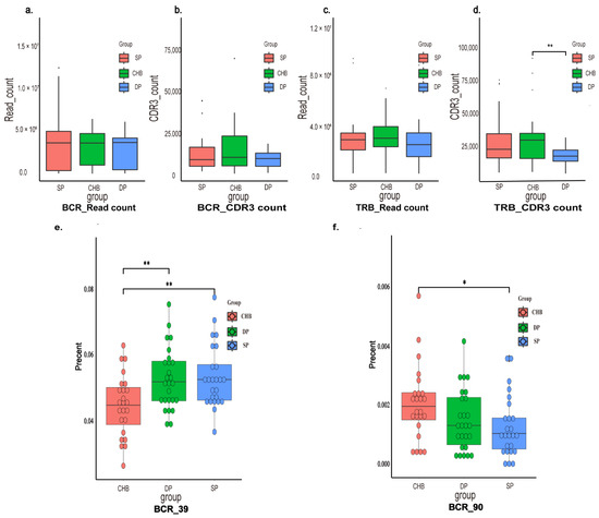 Sequence profiles of the immune repertoires. The upper histograms show the read counts (a,c) and CDR3 counts (b,d) of BCR and TRB. The CDR3 counts of TCR in DP group were lower than SP group (d). The lower histograms show the CDR3 length distribution of immune repertoires in three groups. The frequency of CDR3 sequence in BCR with 39 nucleotides increased significantly in DP group compared with CHB group (e) and 90 nucleotides decreased in SP group compared with CHB group (f). p-values < 0.05, or <0.01 were denoted by “*”, and “**”, respectively. Abbreviations: CDR3, complementarity-determining region 3; BCR, B-cell receptor; TRB, T-cell receptor β chain; DP, double positive; SP, single positive; CHB, chronic hepatitis B.