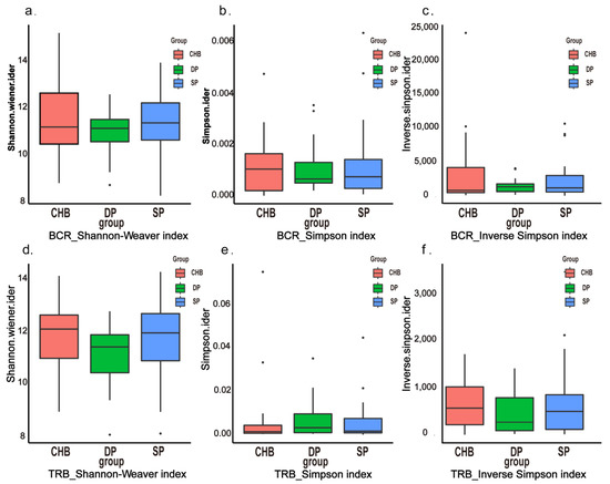 Diversity analysis of immune repertoires. Longitudinal analysis of Shannon index (a,d), Simpson index (b,e), and inverse Simpson index (c,f) for BCR and TRB in the DP, SP, and CHB groups. Abbreviations: BCR, B-cell receptor; TRB, T-cell receptor β chain; DP, double positive; SP, single positive; CHB, chronic hepatitis B.