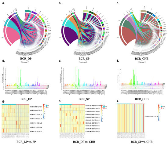 Analysis and comparison of differential genes of V–J gene combinations in BCR. Circos figures (a–c) showed the V–J combination visually. Each color block represents one gene, and the breadth of the block reflects the frequency. The wider the color block, the higher the frequency. Three-dimensional (3D) images (d–f): x-axis shows IGHV genes and z-axis shows IGHJ genes. Heatmap of significantly differential V–J combinations of BCR in DP group vs. SP group, DP group vs. CHB group, and SP group vs. CHB group (log2(FC) > 1, p < 0.017) (g–i). Abbreviations: BCR, B-cell receptor; DP: double positive; SP: single positive; CHB: chronic hepatitis B.