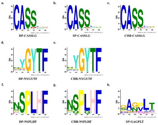 To identify the TRB motif and its potential function in HBV infection, we analyzed the TRB clusters and then predicted the motifs. The top 10 TRB clusters, as evaluated by clusTCR in the three groups, are shown in Supplementary Figure S2 [24]. Next, to elicit motifs among the three groups, we imported the whole CDR3 amino acid of TRB into an online tool MEME and obtained five predicted motifs for each group, including “CASSLG” in identical common (Table 2) [25]. Motif “CASSLG” was selected based on sequence conservation and E-value, and the logos in three groups are demonstrated in Figure 7a–c, which would relate to the HBV infection. We further analyzed the amount and proportion of CDR3 amino acid, which contained the motif “CASSLG” in three groups and found that there were 19.36% (647,282/392,326) in the DP group, 10.21% (444,611/500,000) in the SP group, and 11.74% (506,593/500,124) in the CHB group. The proportion of the CDR3 amino acid containing motif “CASSLG” in the DP group was significantly higher than SP and CHB groups, which indicated that the motif “CASSLG” may be concerned with HBsAg and anti-HBs coexistence in HBV infection. Furthermore, motif “NYGYTF” and “NSPLHF” was predicted both in the DP and CHB group, which would establish a bridge in the HBV-specific motif (Figure 7d–g). Moreover, the motif “GAGPLT” was shown separately in the SP group, indicating that this motif would play an important role in anti-HBs production after HBV vaccination and cure (Figure 7h).