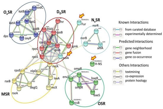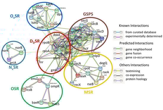 Among 35 SRGs (except for h-ns, fur, ompR, and dnr), 31 were distributed into the five predetermined clusters (Figure 4). There was no direct PIN between GSPS and DdSR, GSPS and NxSR, and GSPS and OSR. In contrast, a PIN was recorded between the GSPS cluster (most of the candidate genes) and the MSR cluster (via nlpD and recA). A PIN was also found to exist between the GSPS cluster (via secA and secV) and the OxSR cluster (via sodB and oxyR). A strong PIN was also observed between the GSPS cluster (most of the candidate genes) and almost all SRGs of the DdSR cluster (except fnr).
