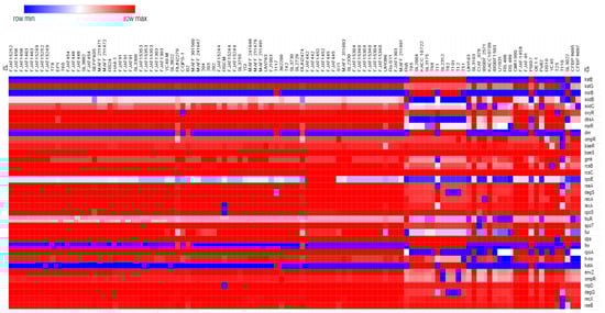 All of the genes coding for stress-responsive enzymes and stress regulators were selected based on the BLAST score (Table S3). To access the distribution of SRGs within different phylotypes of Rs, the data obtained from BLAST results were arranged in a raw data matrix, and a heatmap was generated using Morpheus (https://software.broadinstitute.org/morpheus/) (accessed on 25 May 2022). The cluster analysis was performed with the help of Past 3.17 using binary matrix data (based on the presence or absence of an ortholog) []. The neighbor-joining method was used to construct a cluster dendrogram using 1000 as the bootstrap value.