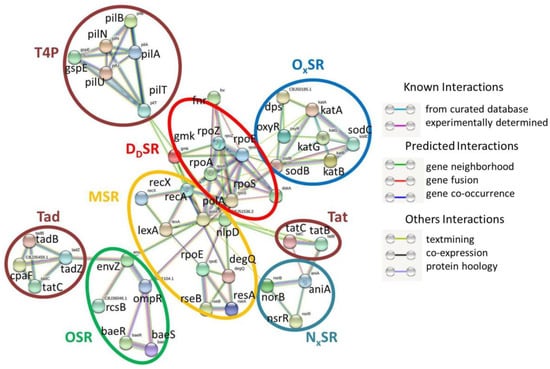 Among these 43 nodes, 12 are represented by different pili candidate genes and are present as three separate clusters representing three different pili systems: type 4 pili or T4P (pilA, pilB, pilN, pilT, pilU, and gspE), tat pili (tatB and tatC), and tad pili (tadB, tadC, tadZ, and cpaF) (Figure 5). The SRGs were distributed into five clusters as before (Figure 5). A PIN was observed between T4P (via pilT) and DdSR (via gmk) and MSR (via recA), between Tat (via tatC and tatD) and MSR (via nlpD), DdSR (via recA), and NxSR (via aniA), and between Tad (via tadZ) and OSR (via envZ).