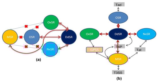 In this work, we show the interaction of various SRG clusters with specific secretion components. For example, T3SS, GSPs, and T4P are related to MSR and DdSR, while Tad and Tad interact with OSR and NxSR, respectively (Figure 6b). A detailed transcriptome analysis of Rs provides the experimental proof that genes encoding T3SS (hrpY, hrpX, hrpK, and hrcT) and T4P (pilG, pilH, pilN, pilM, pilY, pilW, and fimV) are upregulated during host infection, along with peroxidases, catalases (katE and katG), and alkyl hydroperoxide reductases (ahpC1 and ahpF), suggesting adaptations to combat stress during plant infection []. Recently, Hendrich et al. also provided experimental proof that NxSR regulates T3SS in Rs []. Taken together, these findings indicate a close connection between bacterial stress management and secretion systems.