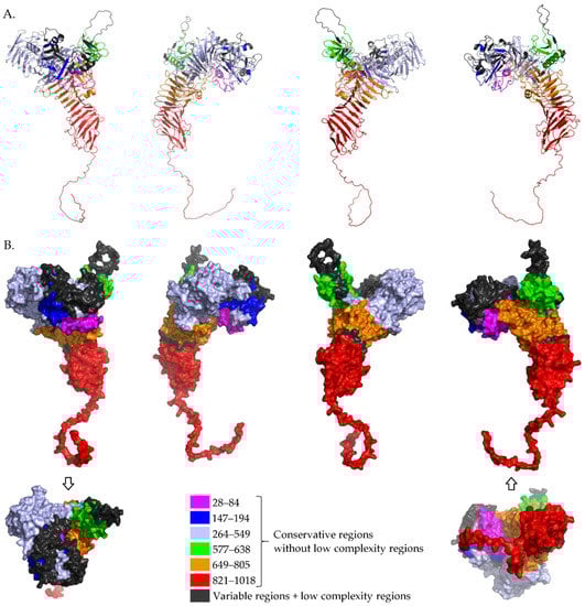 Figure 1 shows mapping of these proposed highly similar regions (see Table 2) of tested IgA1 protease sequences to an AlphaFold2 [23,24] model of IgA1 protease from N. gonorrhoeae strain ATCC 700825/FA 1090 (https://alphafold.ebi.ac.uk/entry/Q5F9W2, accessed at 9 June 2022), region 28–1018. This protein sequence is shown aligned in Multiple Sequence Alignment in Supplementary Table S1 where the strain is named as FA 1090, and these regions are: 28–84, 147–194, 264–549, 577–638, 649–805 and 821–1018. In Figure 1, these conservative regions are shown in different colors and one can see that they are presented on the protein surface. They can be considered for further investigation (in silico, in vitro, in vivo) when designing an active ingredient of a universal vaccine against N. meningitidis, N. gonorrhoeae and some strains of H. influenzae.
