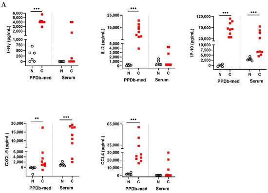 (A) Levels of IFNγ, IL-2, IP-10, CXCL-9 and CCL4 in stimulated whole blood supernatants and serum. Whole blood was stimulated for 24 h with PPDb or medium (med) alone and supernatants were assessed for the presence of cytokines and chemokines by ELISA. Shown are PPDb minus medium stimulated whole blood (PPDb-med) and serum concentrations expressed in pg/mL and compared using Mann–Whitney U test. N: Naive animals (cohort 1, n = 6, empty circles); C: M. bovis challenged animals sampled twelve weeks post-challenge (n = 9, red squares); ** p < 0.01; *** p < 0.001. (B) Protein levels of IL-1β, IL-6, IL-8 and IL-17A in stimulated whole blood supernatants and serum. Whole blood was stimulated for 24 h with PPDb or medium alone, and supernatants were assessed for the presence of cytokines and chemokines by ELISA. Shown are PPDb minus medium stimulated whole blood and serum concentrations expressed in pg/mL compared using Mann–Whitney U test. N: Naive animals (cohort 1, n = 6, empty circles); C: M. bovis challenged animals sampled twelve weeks post-challenge (n = 9, red squares).