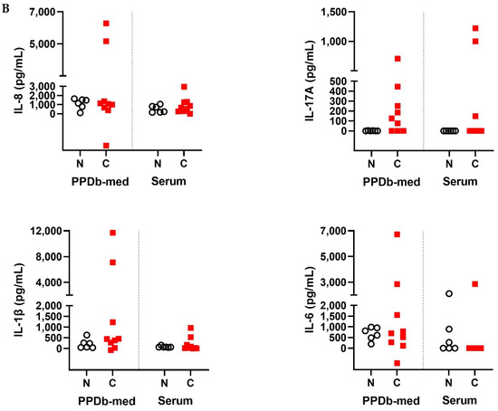 Assessment of IL-8, IL-17A, IL-1β and IL-6 demonstrated elevated PPDb-specific levels for these cytokines in the M. bovis challenged cohort, although statistical significance was not reached. Serum concentrations of IL-8, IL-17A, Il-1β and IL-6 were generally very low or not detectable (Figure 1B, Supplementary Materials Table S3).
