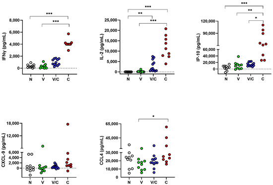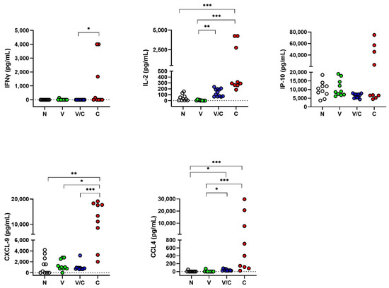 Protein levels of IFNγ, IL-2, IP-10, CCL4 and CXCL-9 in serum samples assessed by ELISA. Concentrations expressed in pg/mL compared using the Kruskal–Wallis test with Dunn’s multiple comparison post-test. N: Naive Animals (cohort 2, n = 10, empty circles); V: BCG-vaccinated animals (n = 10, green circles); V/C: BCG-vaccinated and M. bovis challenged (n = 12, blue circles); C: M. bovis challenged only (n = 9, red circles). * p < 0.05; ** p < 0.01; ***, p < 0.001.