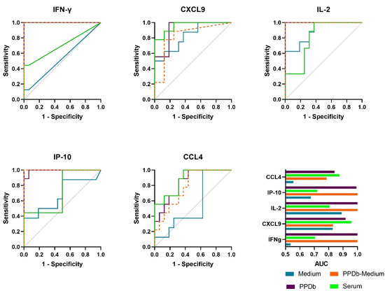 Receiver operator characteristic (ROC) curves of IFN-γ, CXCL9, IL-2, IP-10 and CCL4 detected in medium (blue), PPDB-stimulated whole blood supernatants (purple), PPDb-corrected for background (medium) values (orange) and serum (green) showing accuracy to differentiate M. bovis challenged animals (n = 9) from naive animals (n = 16). The bottom right panel provides an overview of the AUCs determined per protein in both serum and stimulated whole blood supernatant as determined in the depicted ROC curves.