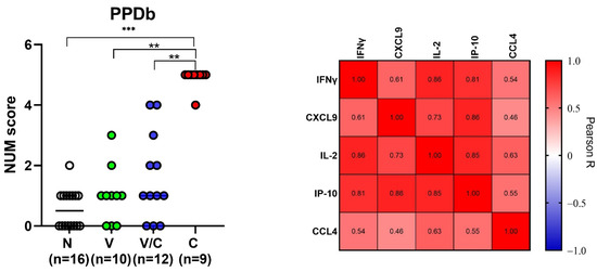 NUM score calculated based on IFN-γ, CXCL9, IL-2, IP-10 and CCL4 levels in PPDB-stimulated whole blood supernatants (cut-off values determined based on the optimal Youden’s index for naive (n = 16), BCG-vaccinated (n = 10) and M. bovis challenged animals with (n = 12) or without prior BCG vaccination (n = 9). The NUM score combines the results of the five proteins (y-axis), indicating the number of proteins with levels above a threshold as determined by the Youden’s index (Table 1). Group differences were determined using the Kruskall–Wallis test; the statistical significance level used was p < 0.05. ** p < 0.01, *** p < 0.001 (left). Heat map showing Pearson correlation among concentrations of the evaluated host proteins. The color corresponds to the Pearson R value as indicated in each square (right).